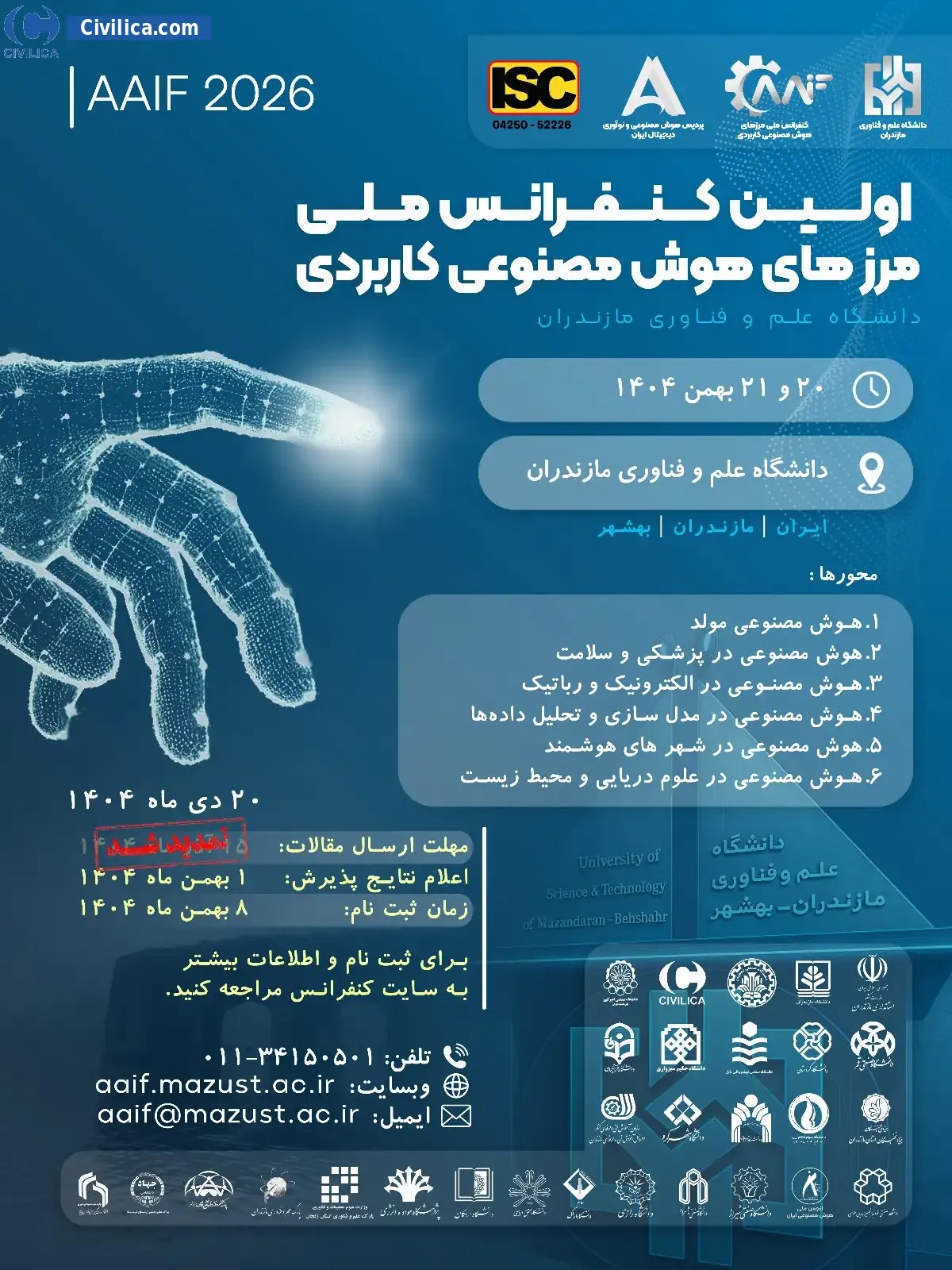 The 1st National Conference on Applied Artificial Intelligence Frontiers In date 2026-02-09 by University of Science and Technology of Mazandaran, in City Behshahr will be held.Since the conference held officially, all of this Conference paper and proceedings will be indexed in the Civilica database and Iranian Consortium of National Content (ICNC) and you can have full confidence. |