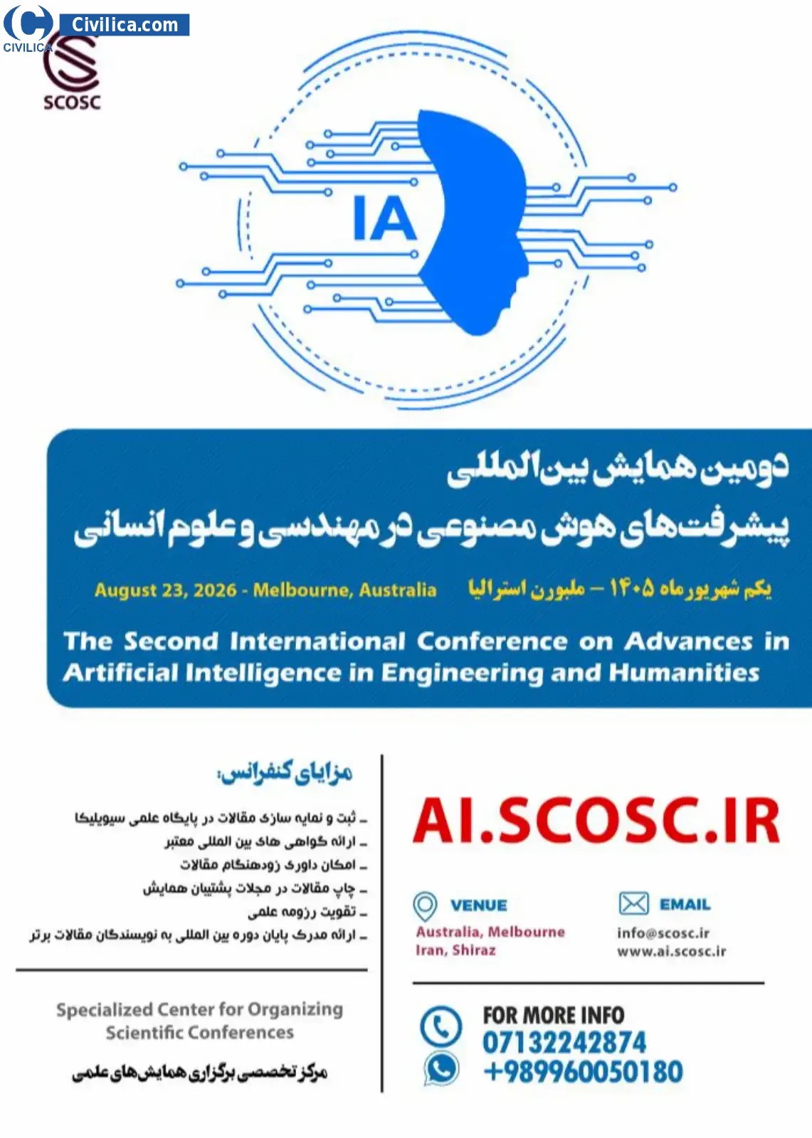 The Second International Conference on Scientific Studies in Humanities, Management and Law In date 2026-08-23 by ,مرکز تخصصی همایش ها will be held.Since the conference held officially, all of this Conference paper and proceedings will be indexed in the Civilica database and Iranian Consortium of National Content (ICNC) and you can have full confidence. |