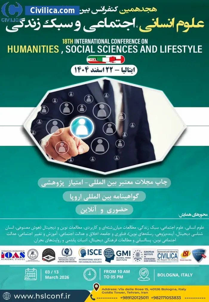 18th International Conference on Humanities, Social Sciences and Lifestyle In date 2026-03-13 by ,سازمان بین المللی مطالعات دانشگاهی will be held.Since the conference held officially, all of this Conference paper and proceedings will be indexed in the Civilica database and Iranian Consortium of National Content (ICNC) and you can have full confidence. |