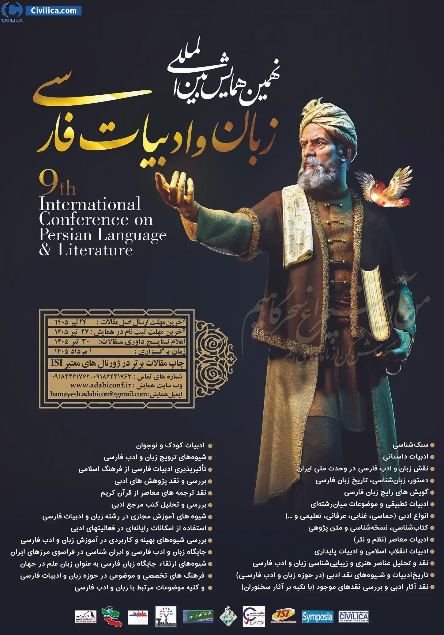 Ninth International Conference on Persian Language and Literature In date 2026-07-23 by ,دبیرخانه دائمی کنفرانس in City Hamadan will be held.Since the conference held officially, all of this Conference paper and proceedings will be indexed in the Civilica database and Iranian Consortium of National Content (ICNC) and you can have full confidence. |