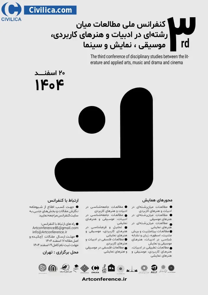 The third national conference of interdisciplinary studies in literature and applied arts, music, theater and cinema In date 2026-03-11 by ,فصلنامه مطالعات هنر و زیبایی شناسی in City Tehran will be held.Since the conference held officially, all of this Conference paper and proceedings will be indexed in the Civilica database and Iranian Consortium of National Content (ICNC) and you can have full confidence. |