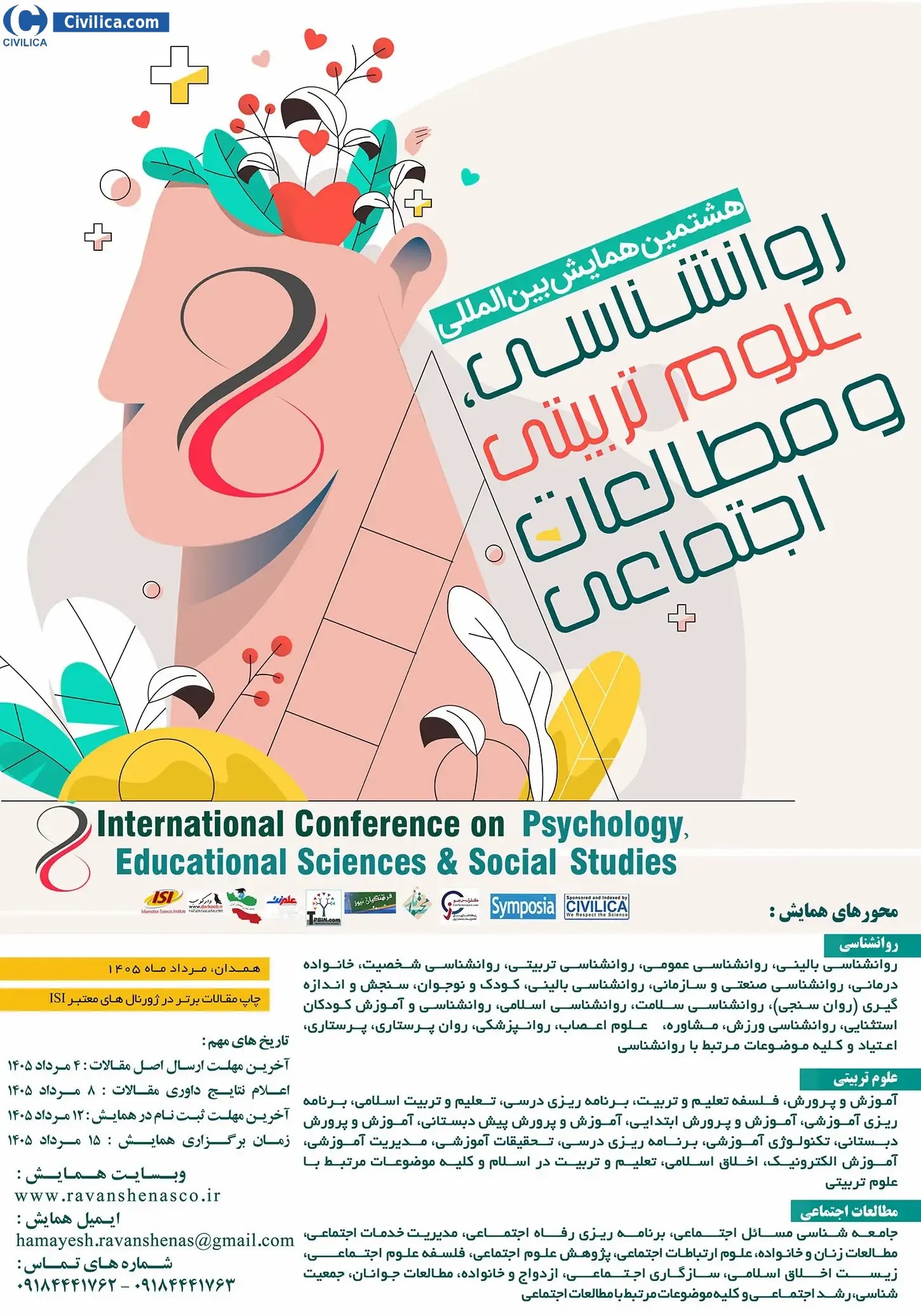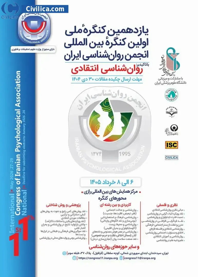 11th Annual and 1st International Congress of Iranian Psychological Association Critical Psychology In date 2027-02-17 by Iranian Psychological Association in City Tehran will be held.Since the conference held officially, all of this Conference paper and proceedings will be indexed in the Civilica database and Iranian Consortium of National Content (ICNC) and you can have full confidence. |