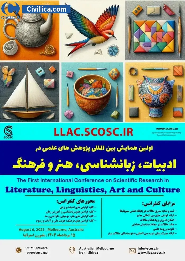 The Second International Conference on Scientific Research in Literature, Linguistics, Art and Culture In date 2026-08-06 by ,مرکز تخصصی برگزاری همایش ها will be held.Since the conference held officially, all of this Conference paper and proceedings will be indexed in the Civilica database and Iranian Consortium of National Content (ICNC) and you can have full confidence. |