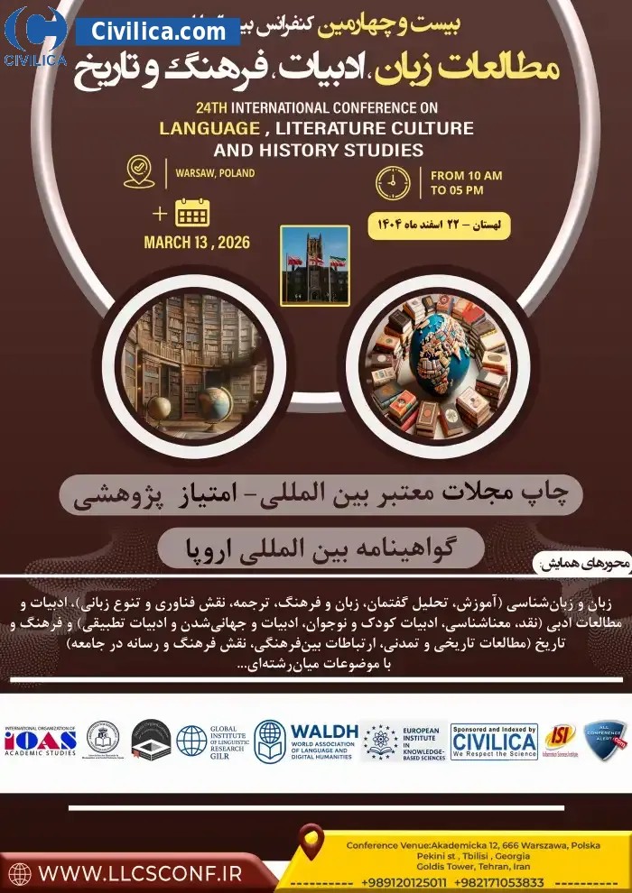 24th International Conference on Language , Literature , Culture and History Studies In date 2026-03-13 by , سازمان بین المللی مطالعات دانشگاهی(International Organization of Academic Studies و مرکز همایش ایران in City Tehran will be held.Since the conference held officially, all of this Conference paper and proceedings will be indexed in the Civilica database and Iranian Consortium of National Content (ICNC) and you can have full confidence. |