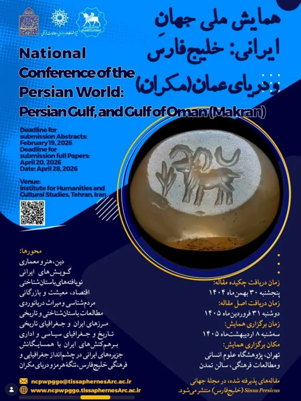 National Conference on the Iranian World: Persian Gulf and Sea of Oman (Makran) The Institute of Humanities and Cultural Studies, the Tissaphernes Archaeological Research Group, and the Cultural Heritage and Tourism Research Institute will hold the “National Conference on the Iranian World: Persian Gulf and Sea of Oman (Makran)” on May 8, 1405 https://www.ncpwpggo.tissaphernesarc.ac.ir |
