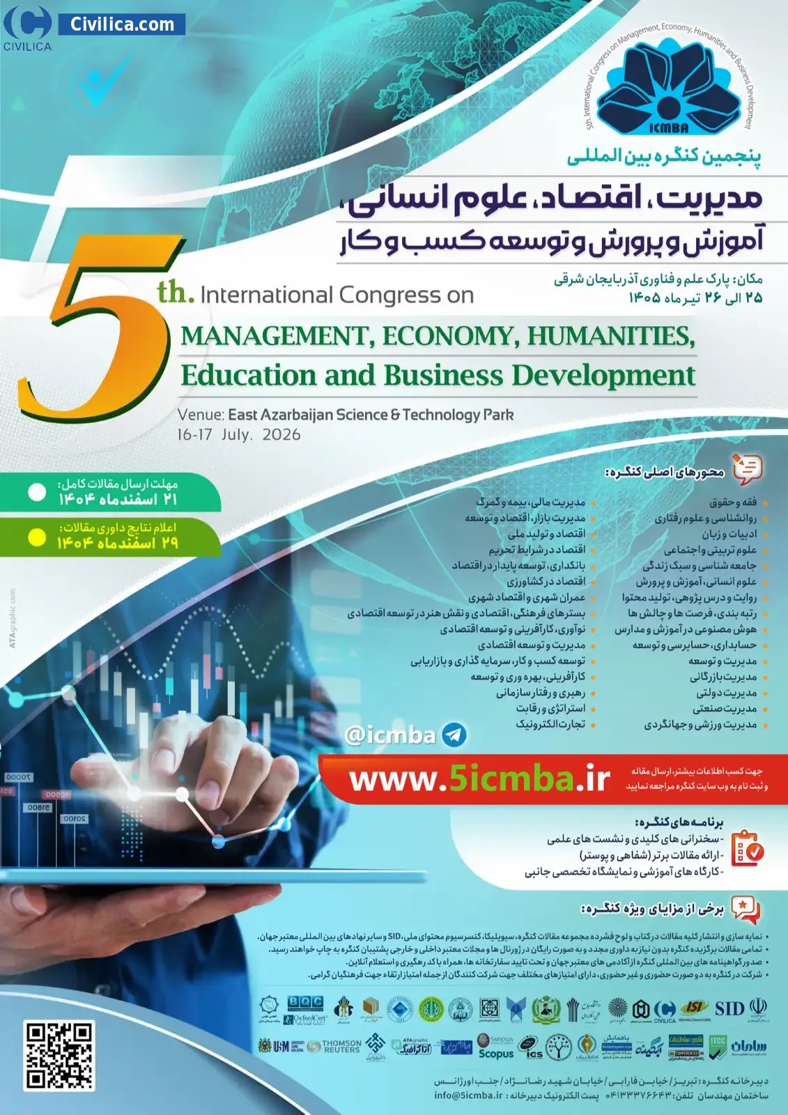 5th.International Congress on Management, Economy, Humanities, Education and Business Development In date 2026-07-16 by ,دبیرخانه دائمی کنگره با همکاری، پارک علم و فناوری آذربایجان شرقی، و سایر دانشگاه های برجسته کشور will be held.Since the conference held officially, all of this Conference paper and proceedings will be indexed in the Civilica database and Iranian Consortium of National Content (ICNC) and you can have full confidence. |