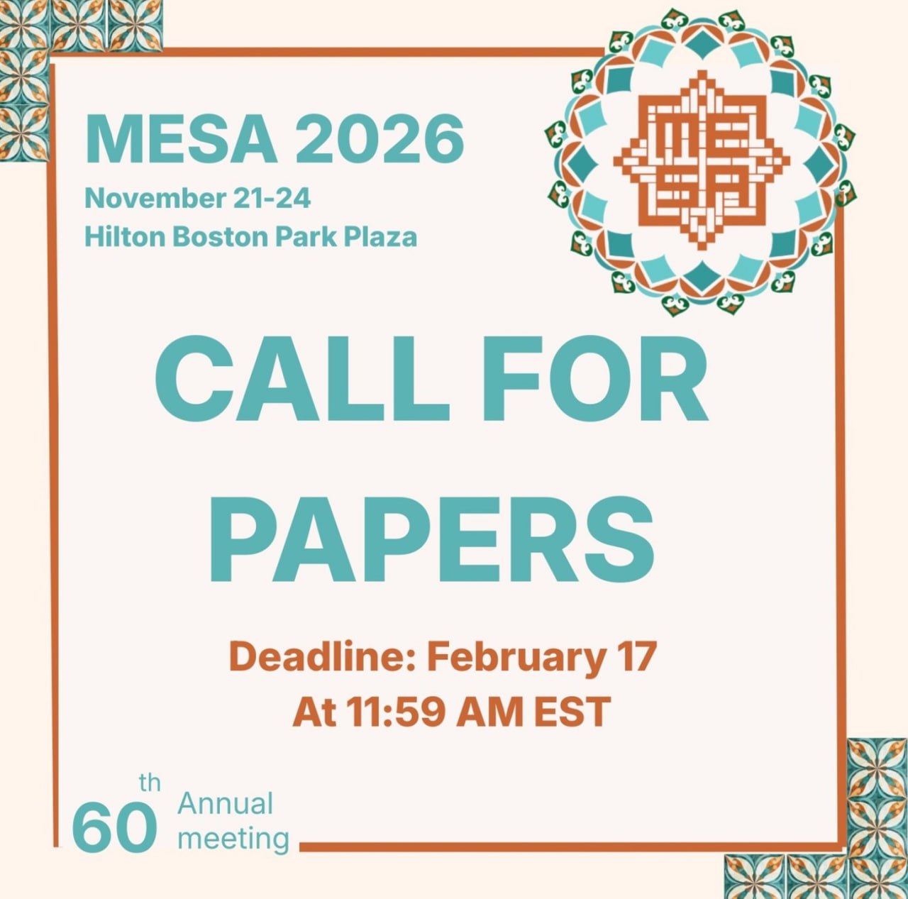 Middle East studies Association Conference MESA invites your proposals for panels, roundtables, and individual papers for the 60th Annual Meeting in Boston! |