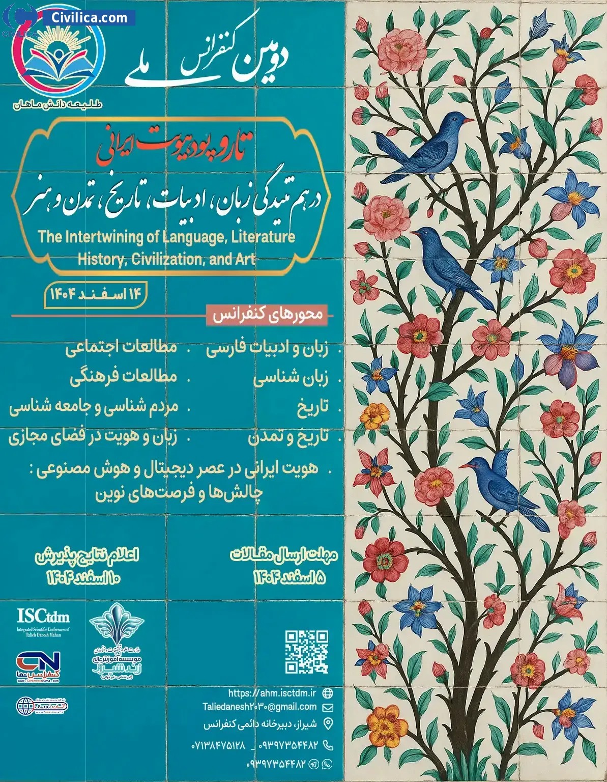The Second National Conference on the Fabric of Iranian Identity: The Intertwining of Language, Literature, History, Civilization, and Art In date 2026-03-05 City Shiraz will be held.Since the conference held officially, all of this Conference paper and proceedings will be indexed in the Civilica database and Iranian Consortium of National Content (ICNC) and you can have full confidence. |
