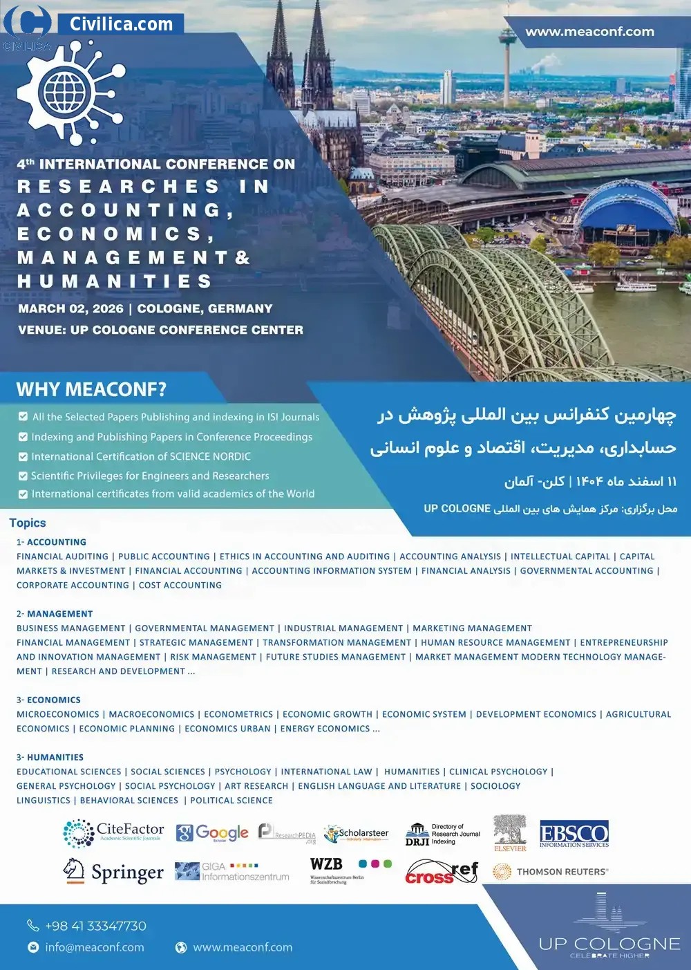 4th International Conference on Researches in Accounting, Economics, Management & Humanities In date 2026-03-02 Cologne, Germany will be held. Since the conference held officially, all of this Conference paper and proceedings will be indexed in the Civilica database and Iranian Consortium of National Content (ICNC) and you can have full confidence. |
