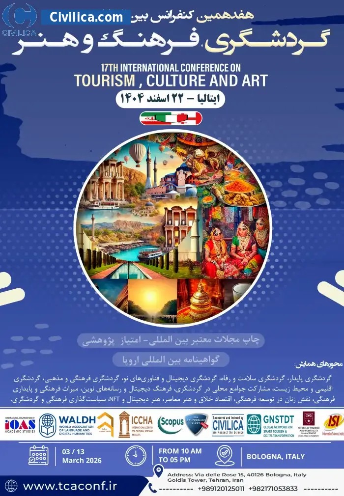 17th International Conference on Tourism, Culture and Art In date 2026-03-13 by ,سازمان بین المللی مطالعات دانشگاهی will be held.Since the conference held officially, all of this Conference paper and proceedings will be indexed in the Civilica database and Iranian Consortium of National Content (ICNC) and you can have full confidence. |