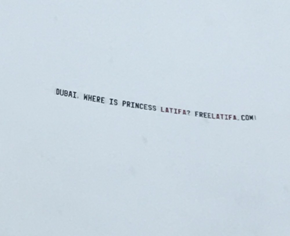 https://en.wikipedia.org/wiki/Latifa_bint_Mohammed_Al_Maktoum_(born_1985) Banner flown at the 2018 Kentucky Derby