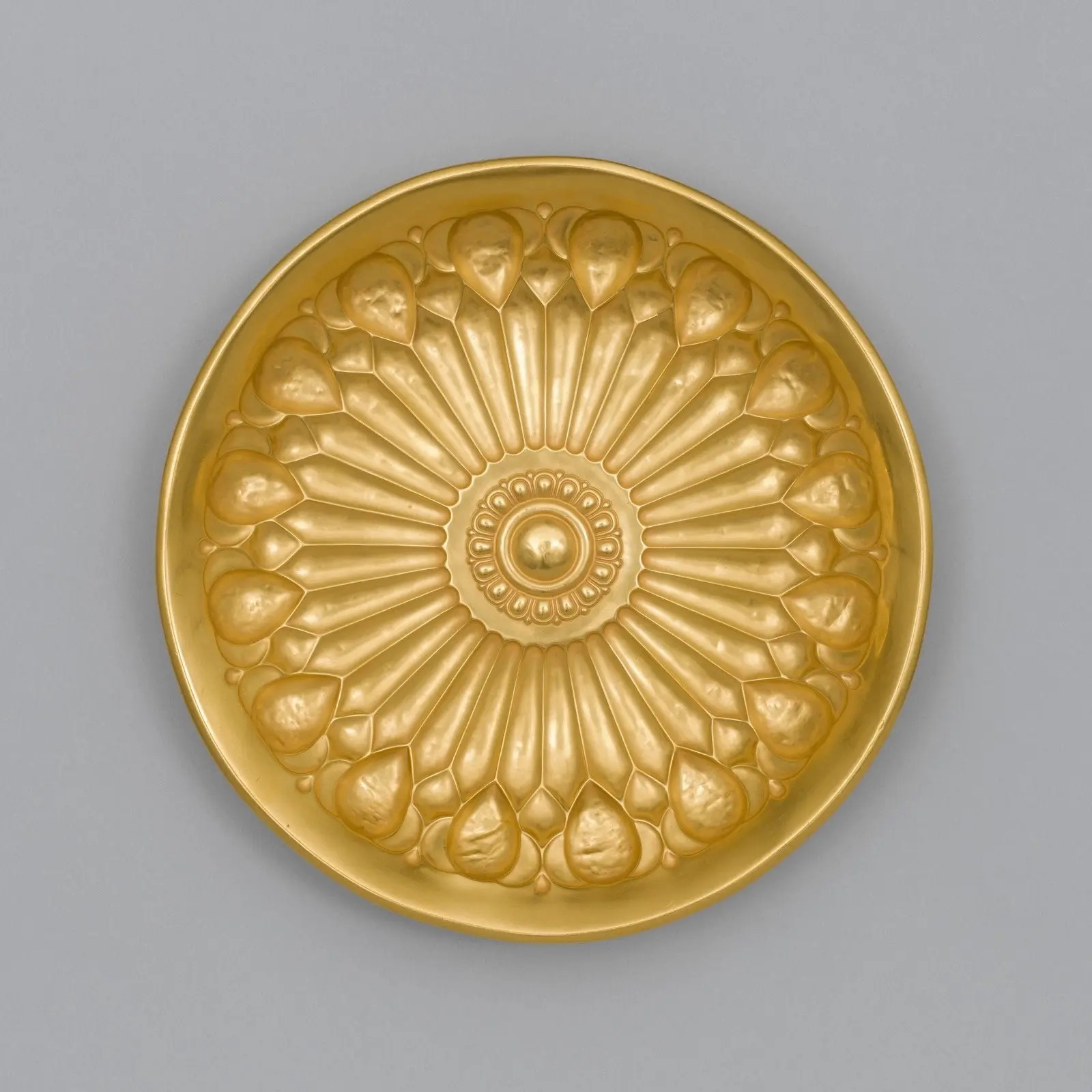 This is a magnificent golden vessel from the Achaemenid dynasty of Iran, representing the height of the art of metalworking and the formal aesthetics of the period. Made of pure gold, it is decorated with a radial and symmetrical pattern of lotus leaves that spread from the center to the periphery; a pattern that is both decorative and a reflection of the cosmic concepts, order, and sacredness of nature in ancient Iranian beliefs.