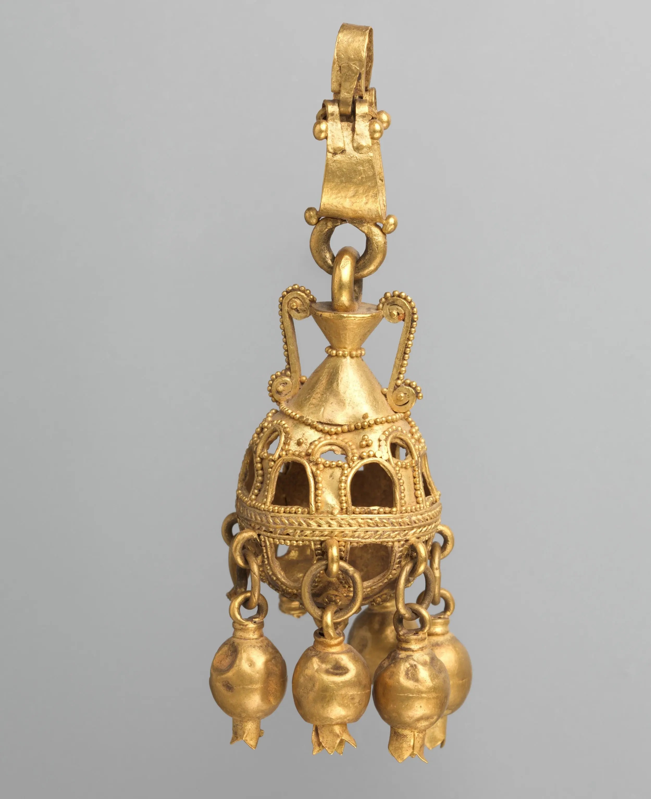 This golden earring with pomegranate-shaped pendants is one of the prominent examples of jewelry from the Parthian dynasty in the Iranian Empire, which dates back more than two thousand years. This work reflects the high skill of ancient Iranian goldsmiths and the special place of jewelry in the culture and social life of that period. The elegance of execution and attention to detail make it an outstanding example of the art of metalwork of the Parthian period.